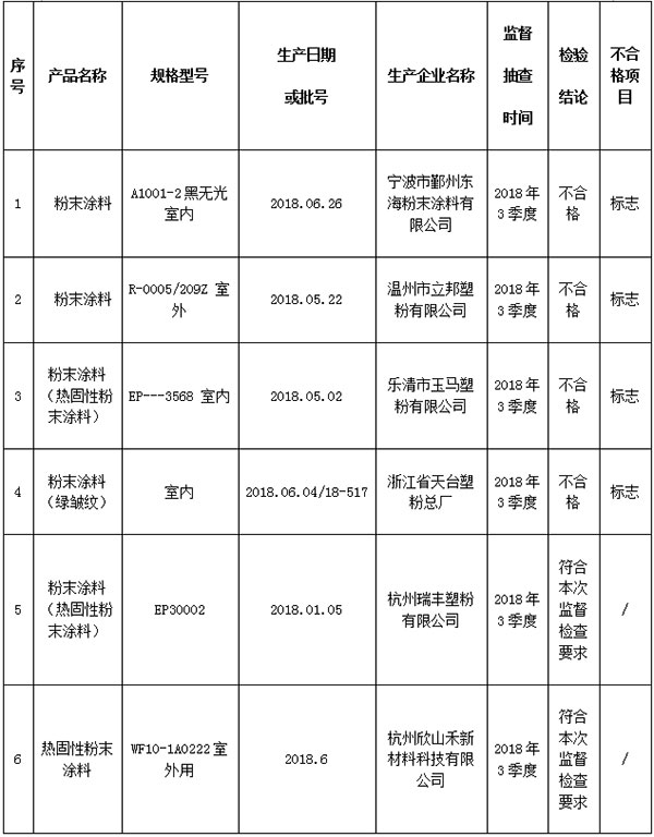 2018年粉末涂料產(chǎn)品監(jiān)督抽查結(jié)果匯總表