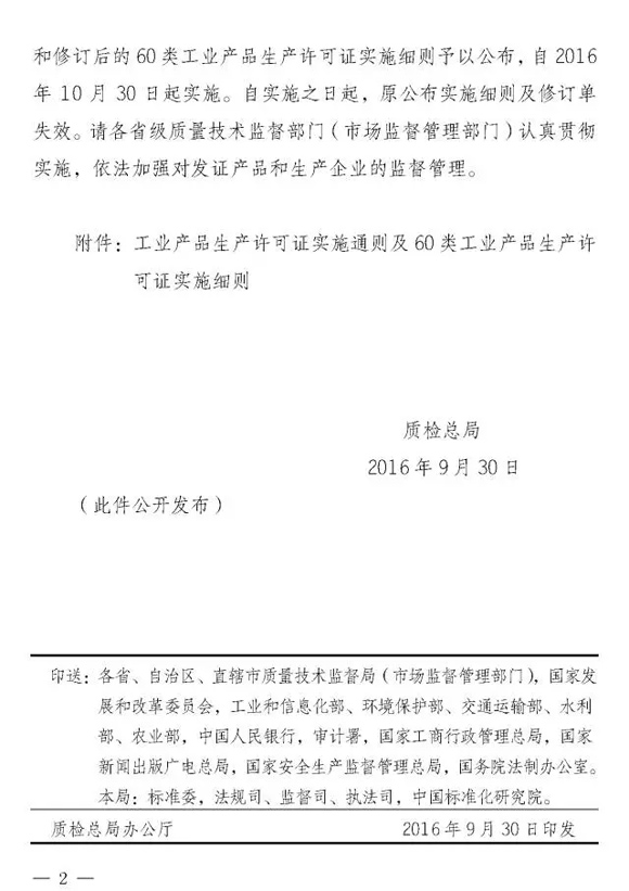 公告主要說明:為落實國務(wù)院行政審批改革要求,進一步推進工業(yè)產(chǎn)品生產(chǎn)許可證制度改革,規(guī)范工業(yè)產(chǎn)品生產(chǎn)許可證工作,根據(jù)《中華人民共和國工業(yè)產(chǎn)品生產(chǎn)許可證管理條例》(國務(wù)院令第440號)、《中華人民共和國工業(yè)產(chǎn)品生產(chǎn)許可證管理條例實施辦法》(國家質(zhì)量監(jiān)督檢驗檢疫總局令第156號)規(guī)定,以及《質(zhì)檢總局關(guān)于深化工業(yè)產(chǎn)品生產(chǎn)許可證制度改革的意見》(國質(zhì)檢監(jiān)〔2015〕364號)精神,質(zhì)檢總局新制定了《工業(yè)產(chǎn)品生產(chǎn)許可證實施通則》、并對60類工業(yè)產(chǎn)品生產(chǎn)許可證實施細則(不含食品相關(guān)產(chǎn)品)進行了修訂,現(xiàn)將《工業(yè)產(chǎn)品生產(chǎn)許可證實施通則》和修訂后的60類工業(yè)產(chǎn)品生產(chǎn)許可證實施細則予以公布,自2016年10月30日起實施。自實施之日起,原公布實施細則及修訂單失效。